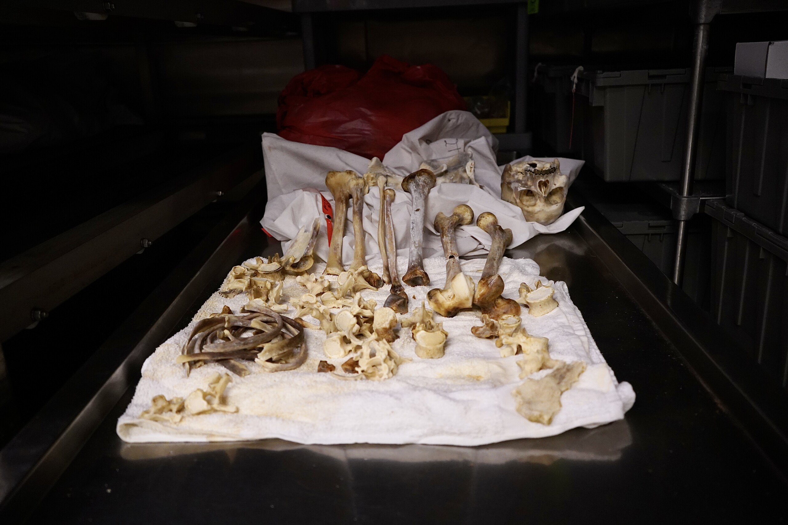 Mesa de trabajo en la Office of the Medical Examiner, Pima County, Arizona. Los restos son de una persona migrante no identificada.