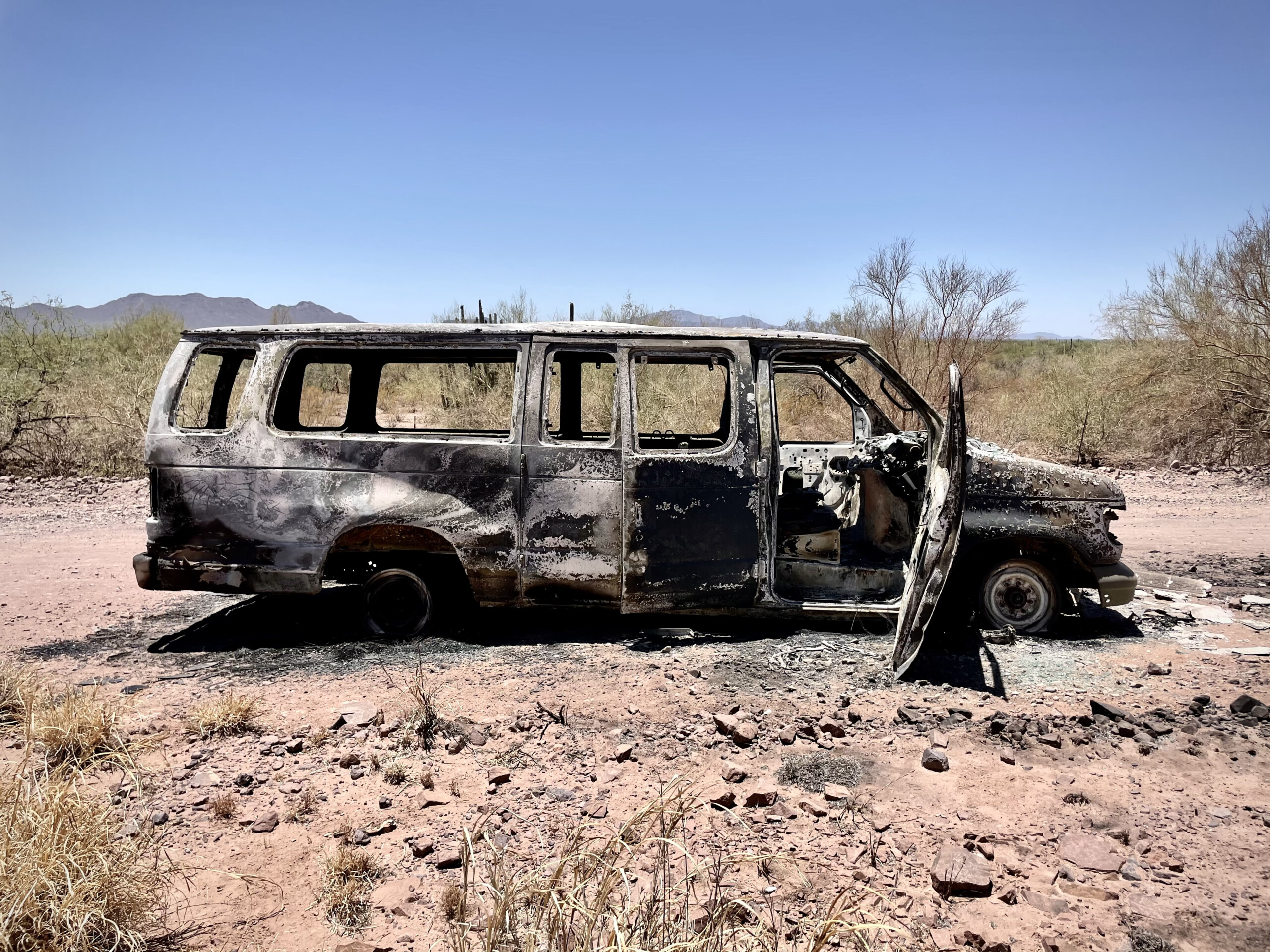 Camioneta de trasporte de migrantes quemada.