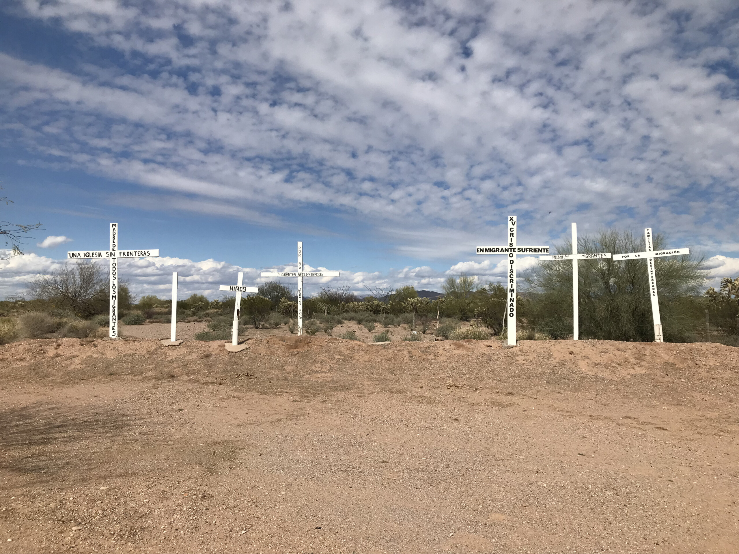 Cruces conmemorativas dedicadas a las personas migrantes muertas y desaparecidas colocadas por grupos cercanos a la iglesia de Altar.